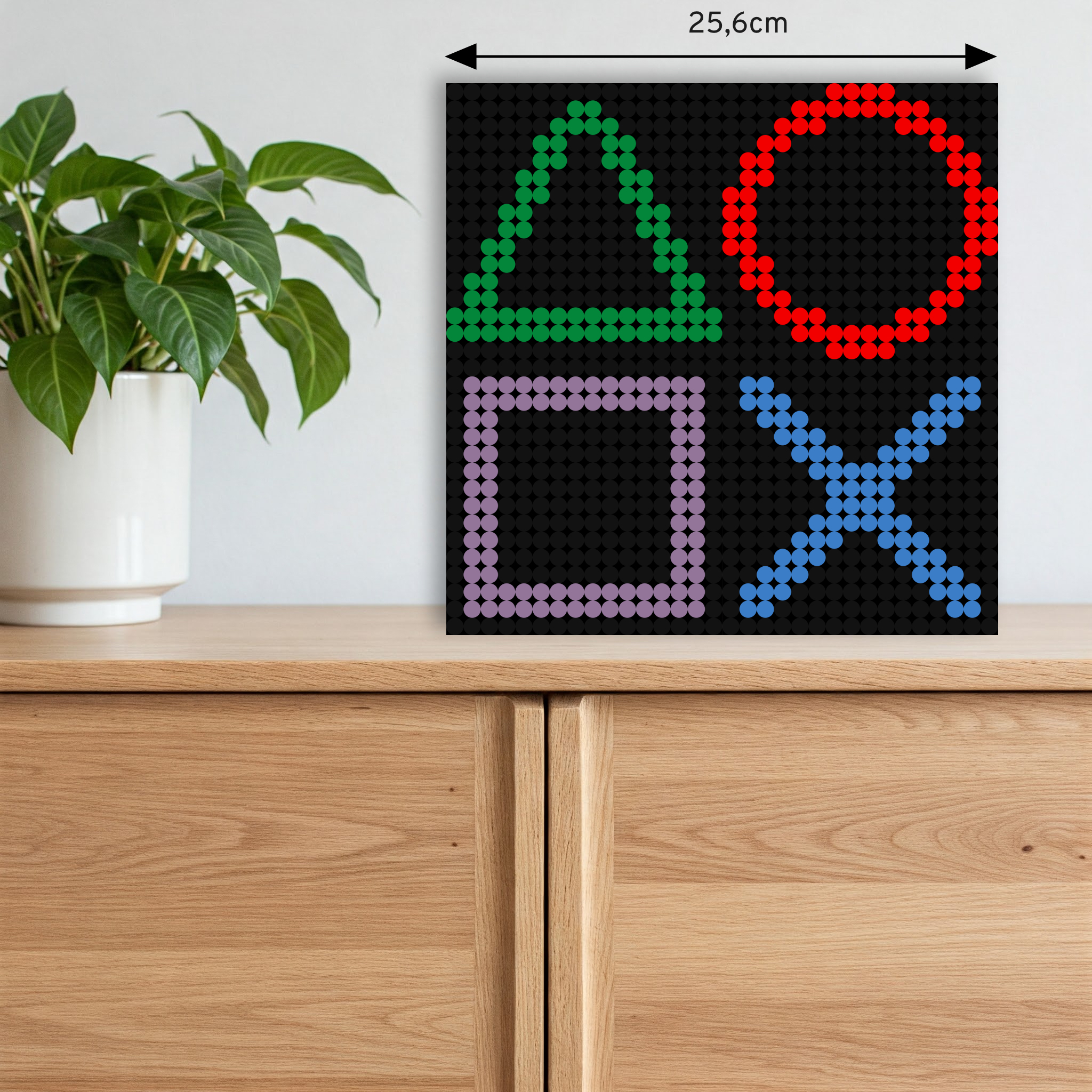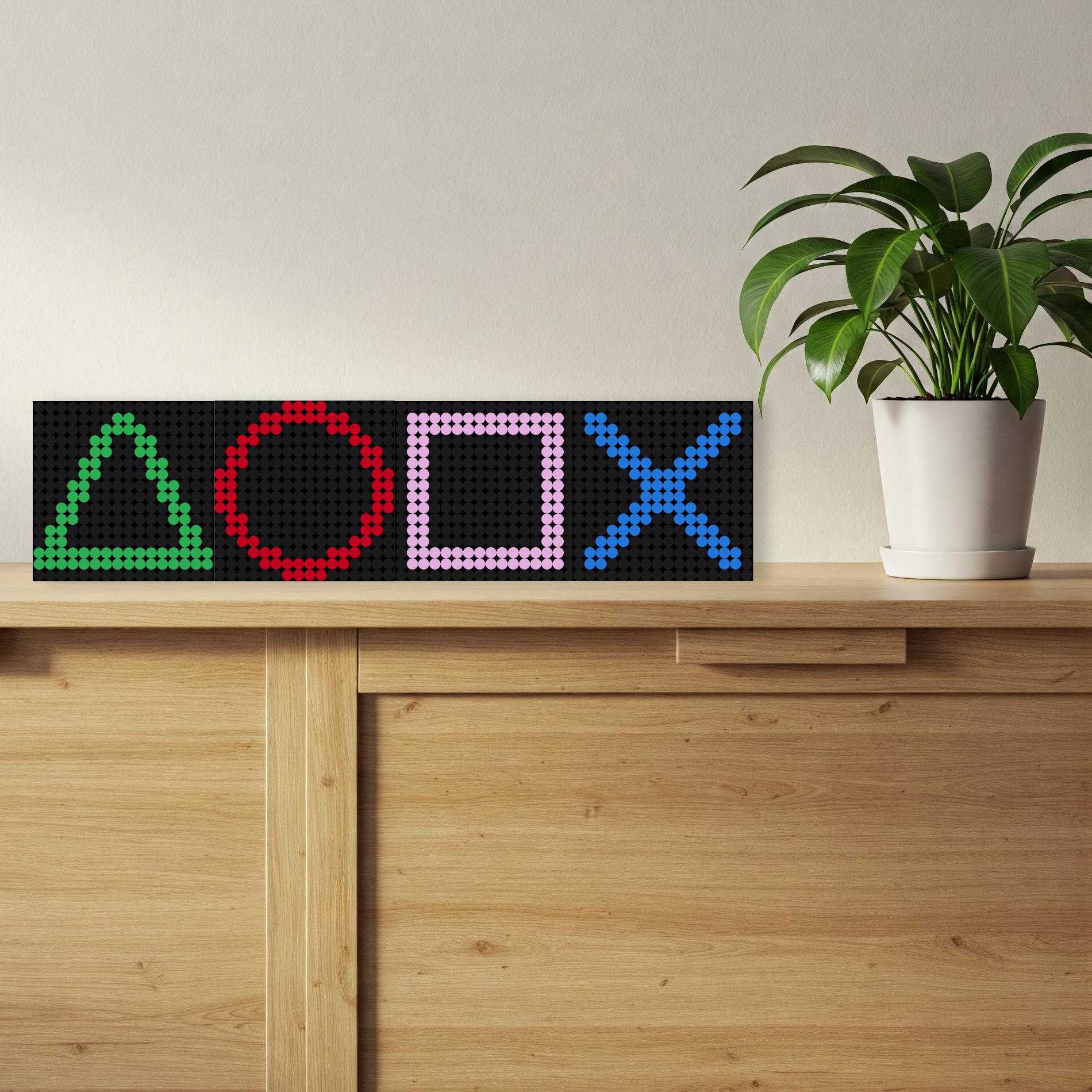 Transforma tu pasión por los videojuegos en una pieza única de arte con nuestro exclusivo set de bricks inspirado en los botones de la play: X, cuadrado, triángulo y círculo. Este kit está diseñado para los verdaderos fanáticos de los videojuegos y el pixel art, combinando creatividad, nostalgia y un toque moderno en un solo producto. Ideal para decorar tu sala de juegos, oficina o habitación, aportando un toque original y geek a tu entorno.