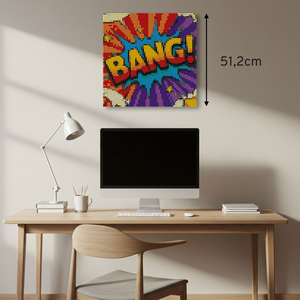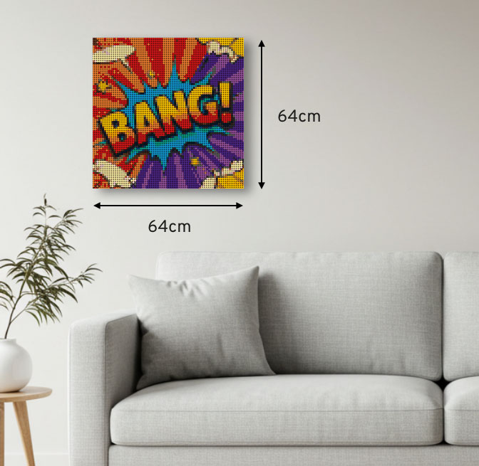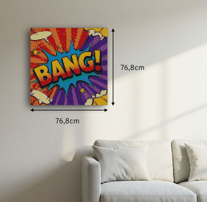 Lleva la emoción del arte pop a tu espacio con este cuadro de bricks inspirado en un cartel explosivo con la palabra «BANG». Este diseño combina tipografía tridimensional con detalles gráficos dinámicos, como explosiones estilizadas y líneas de acción, que evocan el dramatismo y la energía de los clásicos cómics.