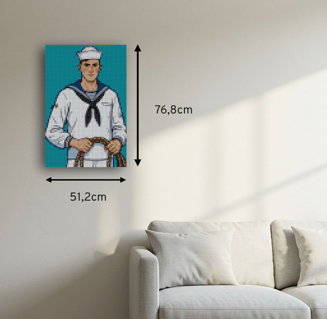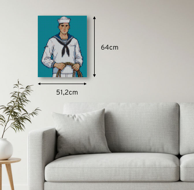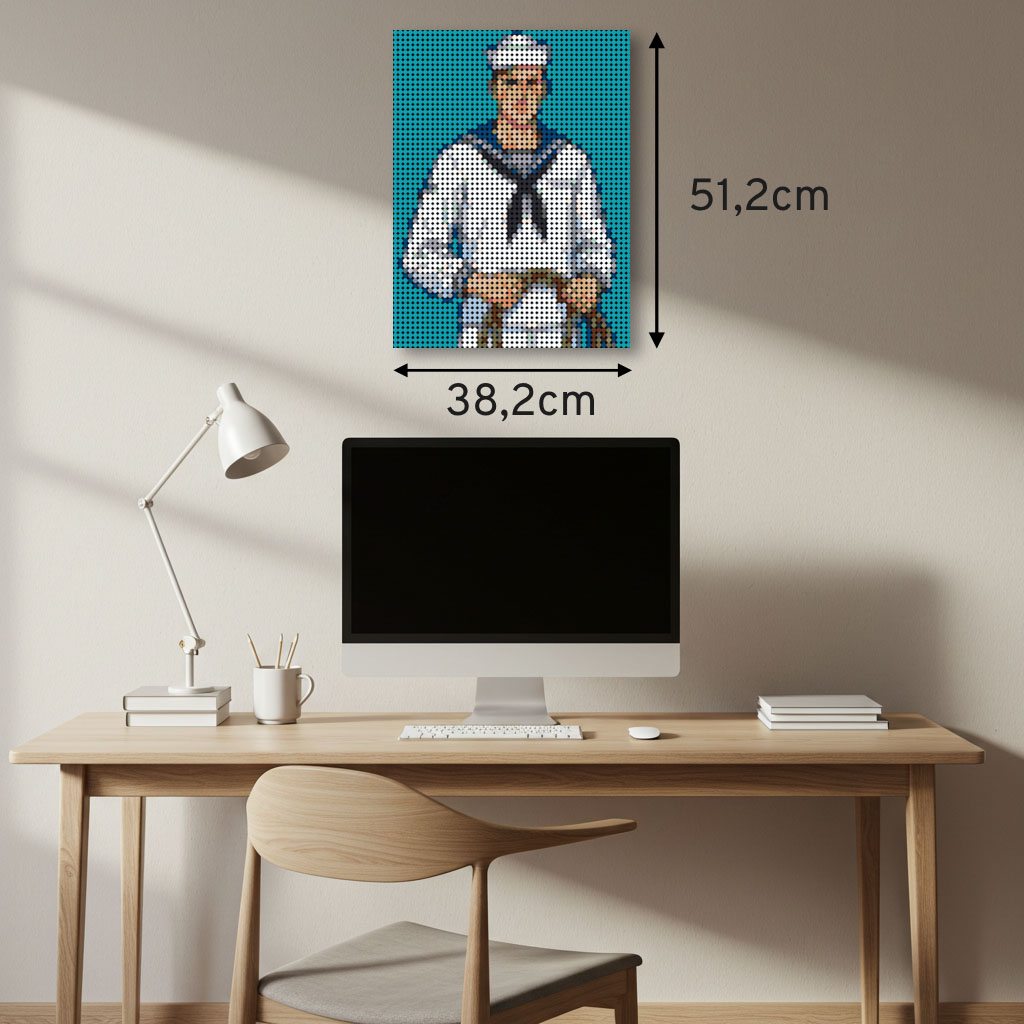 Embárcate en una aventura decorativa con nuestro cuadro de bricks inspirado en un marinero. Este diseño captura el espíritu intrépido del mar, representando detalles clásicos como la gorra náutica, las líneas definidas y la esencia de la vida en alta mar, todo con un enfoque creativo y estilizado.