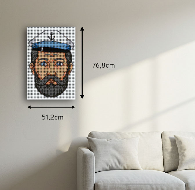 Sumérgete en el mundo del mar con nuestro cuadro de bricks inspirado en la cara de un marinero. Este diseño combina detalles cuidadosamente estilizados y un aire robusto para capturar la esencia del espíritu náutico: valentía, experiencia y aventura en cada línea.