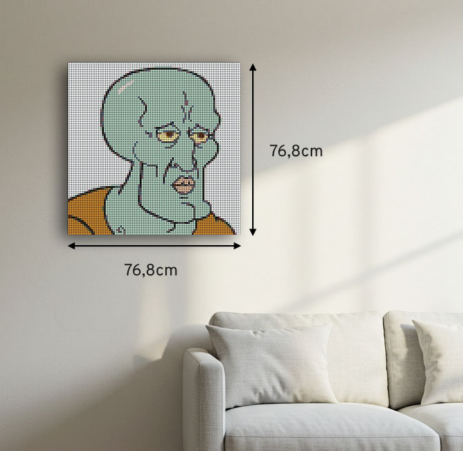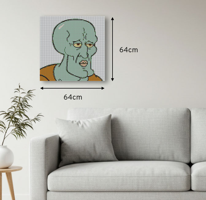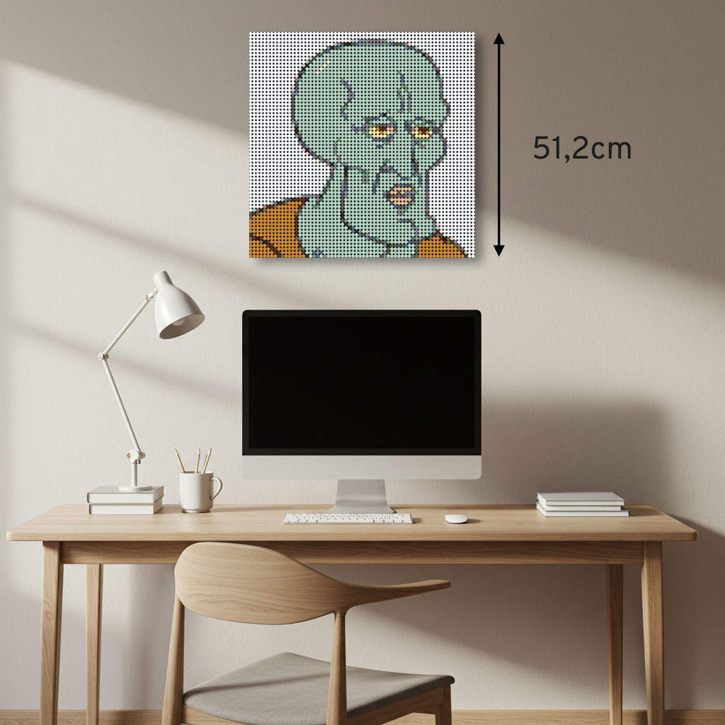 Aporta una dosis de humor refinado y cultura pop a tu decoración con este cuadro de bricks inspirado en el icónico meme de Calamardo Guapo. Este diseño combina líneas elegantes y detalles estilizados para capturar la extravagante confianza y el carisma exagerado del personaje, adaptándolo a una composición única y audaz.