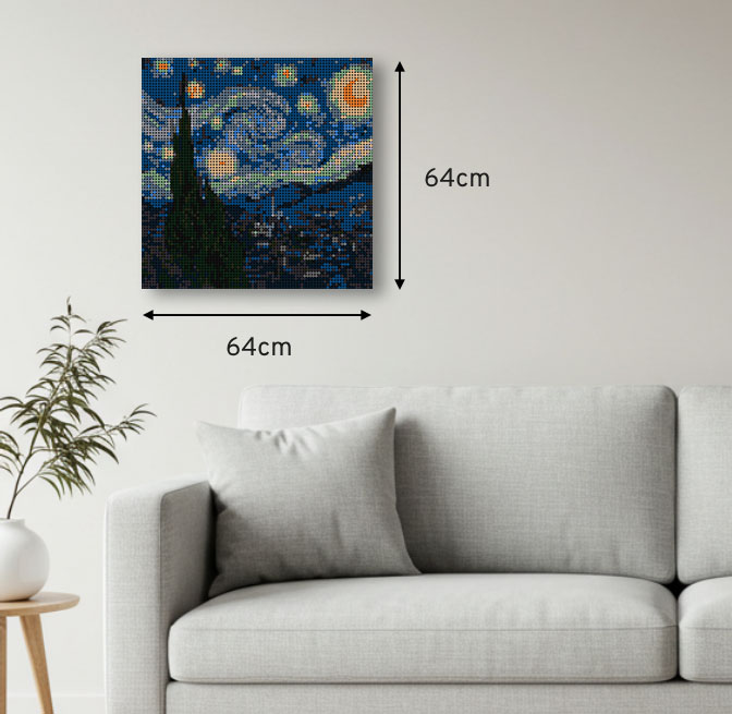 Redescubre la magia de La noche estrellada con este cuadro de bricks que reinventa la emblemática obra de Vincent van Gogh. A través de bloques de colores cuidadosamente diseñados, esta pieza captura el dinamismo y la emoción del cielo nocturno en un formato contemporáneo y único.