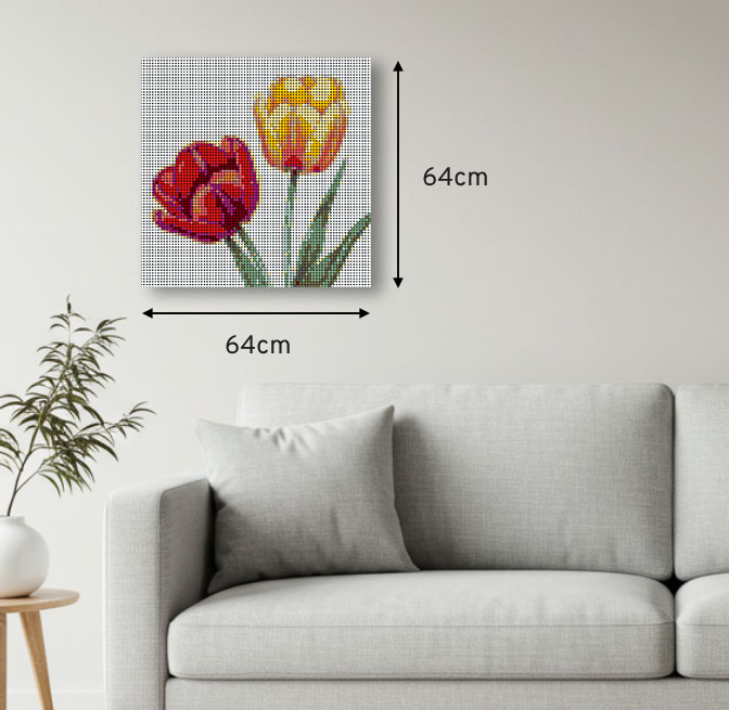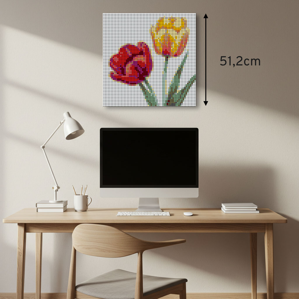 Llena tus espacios de color y frescura con este cuadro de bricks que captura la delicadeza y belleza de los tulipanes. Este diseño combina formas estilizadas y tonos vibrantes que reflejan la esencia de esta flor icónica, conocida por simbolizar la primavera, la renovación y la alegría.